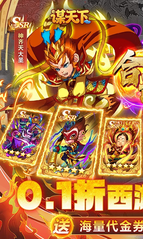 《谋天下(0.1折西游主宰三界)》是一款以《西游记》为背景的高福利回合制卡牌策略手游。游戏里面我们将置身在西游世界里面,展开一段“从凡人到三界主宰”的传奇冒险之旅。游戏里面我们可以集结西游记里面的各路神仙,打造属于自己的西游团队,感受精彩的策略战斗体验!光速游给大家分享谋天下0.1折版下载,游戏支持全场0.1折超低折扣。上线即送至尊满V特权、解锁超多功能,每日签到再领万元真充卡、千抽抽卡令、海量代金券,更有疯狂商城永久激活元宝、银币、经验等等,有兴趣的朋友赶紧来下载吧!