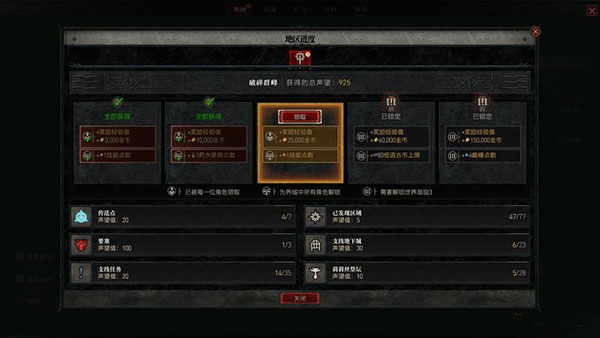 剩下的分支项里,莉莉丝祭坛笔者前文已经说明(参考探索/互动),至于开图探索,则就是看到地图上未开启的地方就跑过去看看就行,同样有经验和声望奖励,地图上也会显示有多少探索点。