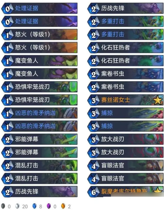快攻瞎是本文推荐的唯一一套携带了迷你系列新卡的卡组。新卡盲眼法官有点类似于当年的滑翔,少了一点破坏性,但过牌效果更强,还有一个完全不亏身材的随从站场,等于白送过牌,实在是超模。盲眼法官的存在让快攻瞎的对局更加流畅,可以快速凑齐大量法术打出Combo斩杀对手。