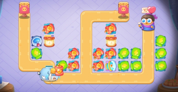 1、第一波开始的时候在右中位置放一个鞭炮,直接升级满级,鞭炮攻击范围大,可以打周围一圈障碍物,之后在右下角建立一个瓶子炮,瓶子炮先打附近障碍物,有金币可以升级瓶子炮,兔子出来的时候先打兔子。
