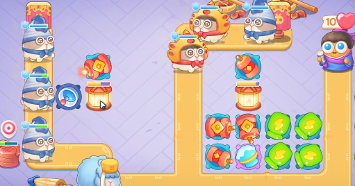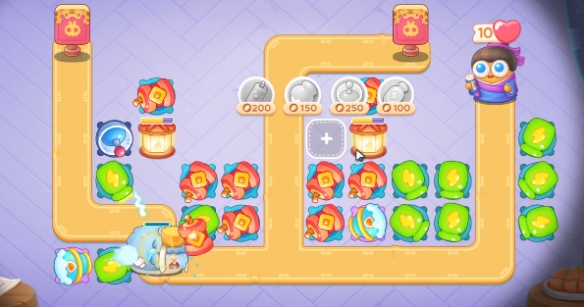9、第九波现在左下角增加一个泡泡塔,在左中增加一个鞭炮,火力不够可以在泡泡塔右边增加瓶子炮,具体塔防如下。