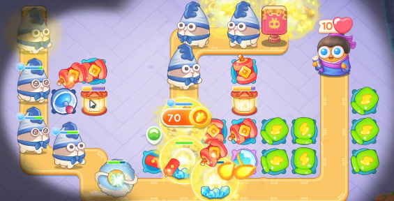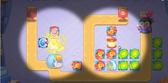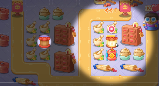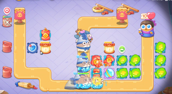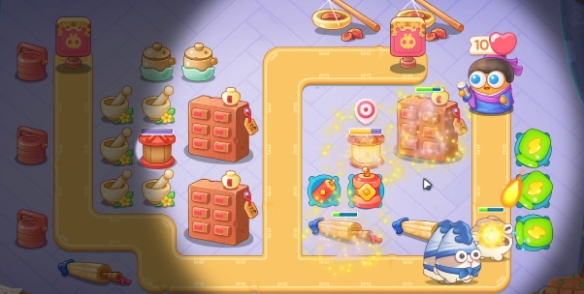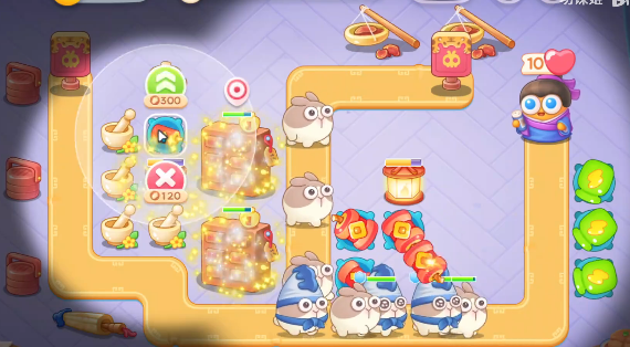 3、第三波,鞭炮在增加一个,有时间就锁定左边药柜减减障碍物的血,左边小药罐打掉之后建立一个鞭炮,有金币升满级。