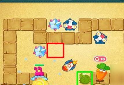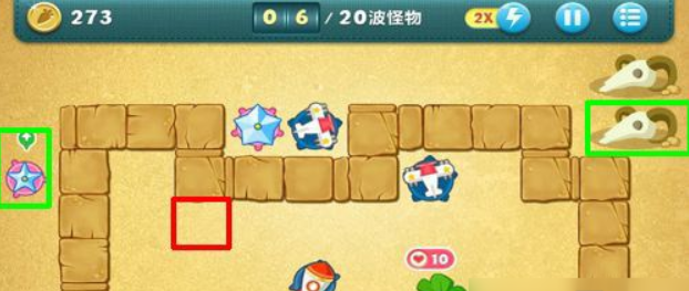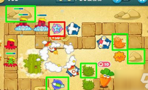 5、摧毁绿色方框中的障碍物后再卖出下方的毒针炮塔,最后把冰冻星星升为顶级。