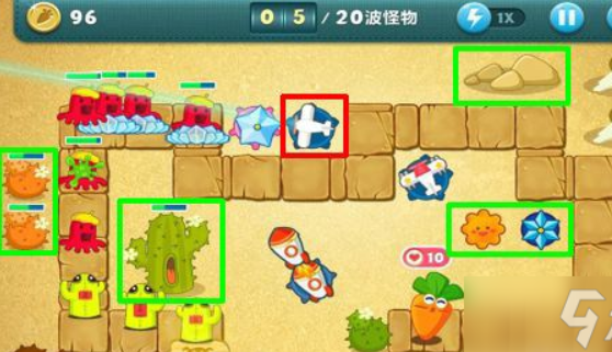 7、由于位置太偏僻了,玩家需要把绿色方框中的障碍物和炮塔都摧毁/出售,然后把红色方框中的玩具飞机升为顶级。