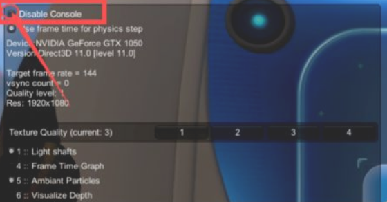 2、接着会出现一个英文界面,其中最顶端的两行是和控制台有关的命令,默认是打钩状态,需要去掉这两个钩钩才能用控制台。