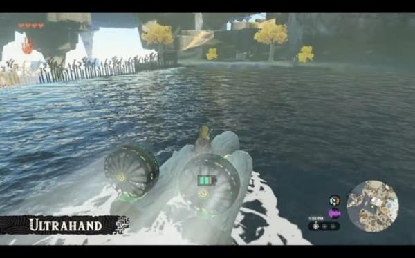在组合了各种武器道具之后,青沼又演示了可以连接材料来搭建载具的“究极手”技能,将地面上的物品组件连接在一起,比如将砍下来的木头连接成木筏,另外还可以连接各种功能组件,青沼演示将三根木桩和两个鼓风机组合成了一个自带“推进系统”的木筏。