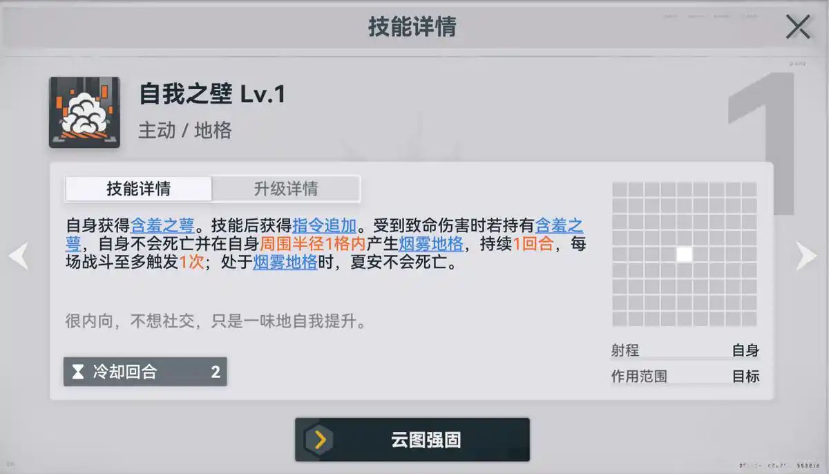 夏安的1技能【自我之壁】能使自己获得【含羞之萼】在提高自身攻击、暴击,锁定自身防御力和生命值上限,还能免疫敌人的位移技能,有队友时无法被敌人索敌。夏安在持有【含羞之萼】状态时若受到致命伤害也不会死亡,并在自身周围生成【烟雾】地格,处于烟雾地格时夏安亦不会死亡。可谓是生存性拉满,但要注意若主动移动将解除【含羞之萼】状态。
