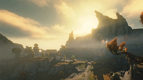 地势平坦且广阔的峡间平原,因散落在地表的、由远古熔岩堆积形成的巨型石柱丛景观而得名。数百年前,七丘文明曾在此扎根并萌生新芽,如今这里仅存一些古村落供旅者们中转、休憩——巨石原通常是异乡人游历七丘高地的起点。