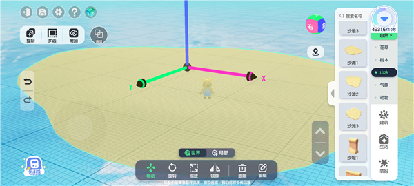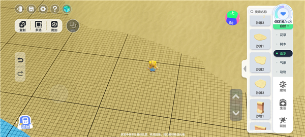 1、地图都有地基,选择创造沙地来模拟这个环境,首先选择自然模组里面的沙地来创造地面环境。