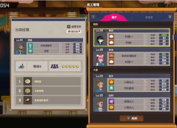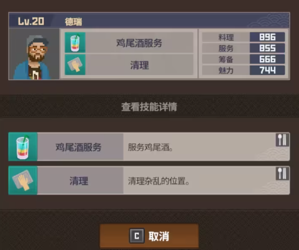 自带的鸡尾酒和清理服务技能在前中期没有解锁分店的时候,当做主店主力服务员使用,过渡很丝滑。