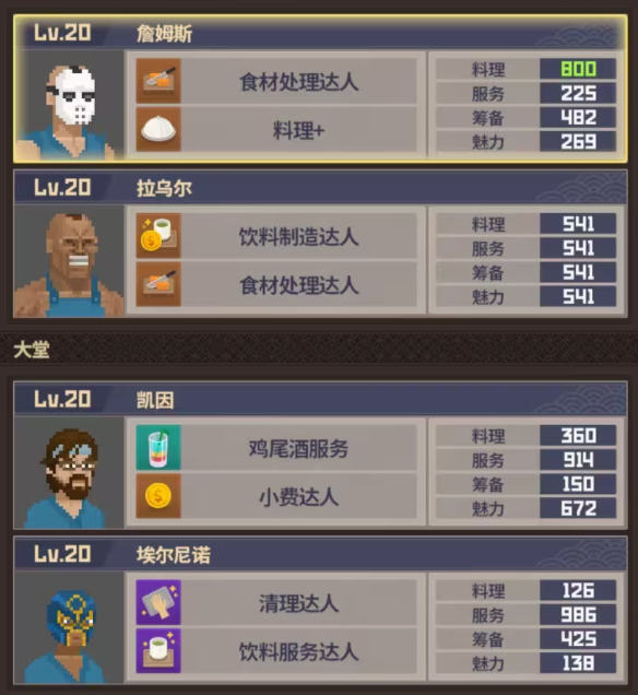 1、主店因为有戴夫充当大堂经理,所以只需要再额外雇佣四人,这里推荐厨房用詹姆斯+拉乌尔,大堂推荐凯因+埃尔尼诺,也就是我们说的牛战士,这个配置下我们只需要做一件事那就是补充芥末,这样基本可以保证每晚都能满评分,满顾客数。