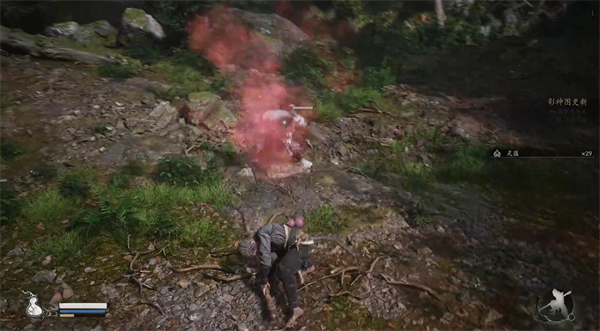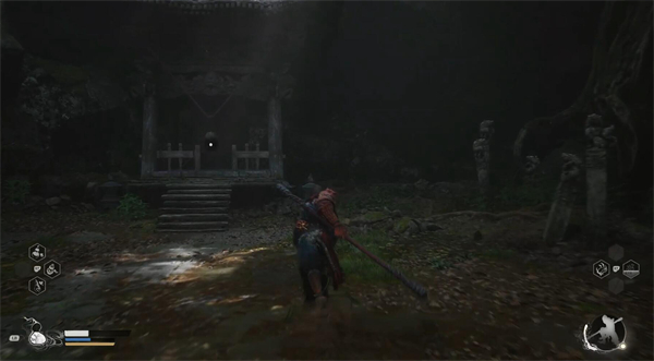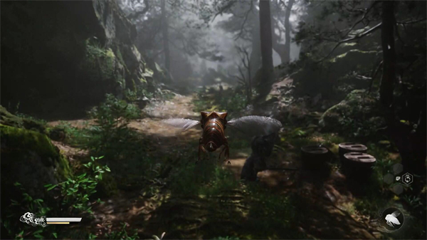 一路沿着山路向上,来到第二处存档点-苍狼林:林外,在我们上香之后,土地爷会教与我们变身术,这里的效果是变身成为蝉,在该状态下我们不会引起敌人的警觉,可用作侦察(当然还是有时间限制的,具体的时间长短看一看屏幕左下角的ui,有一个黄条,那就是变身术的倒计时)