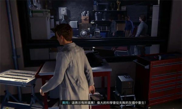 来到奥托博士也就是章鱼博士的实验室触发剧情,剧情后可自由探索实验室,四处转转可以看到一些照片、录音等,还能看到博士和经费委员会在会议室里开会。
