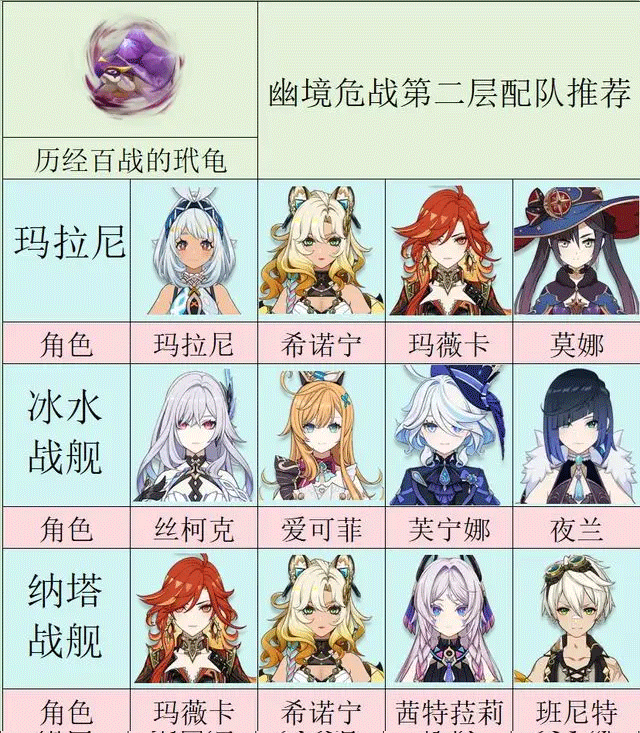 冰水组合:如丝柯克、申鹤、爱可菲、芙芙,第一阶段可冻住玳龟延迟开盾。