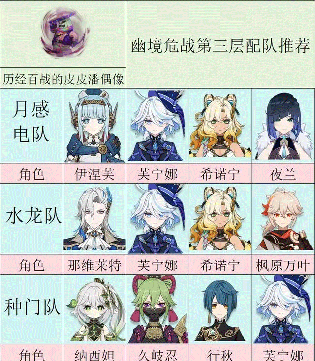其他选择还包括基尼奇的燃烧组合:基尼奇、玛薇卡、伊安珊、艾梅莉埃,或者草久行搭配芙芙也可应对。