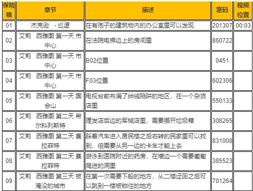 9、艾莉-西雅图-第三天-被淹没的城市:密码箱在第一次需要下船的地方,从二楼迂回之后可以跳到一楼被锁住的地方,密码:701264。