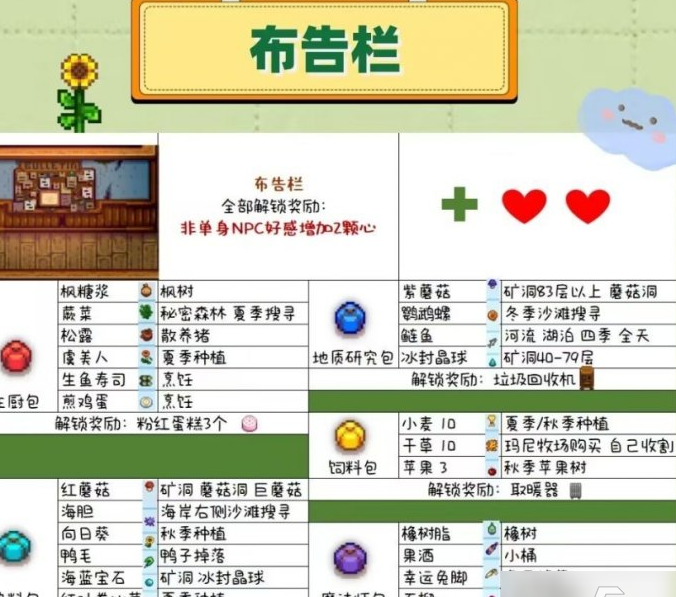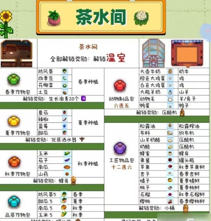 茶水间:建议在第一年的冬天解锁,这样可以使用温室,温室不限制季节,可以种所有的农作物,可以保证冬天的收入,所以要留意茶水间所有的收集包内容,一部分可以在猪车买到。