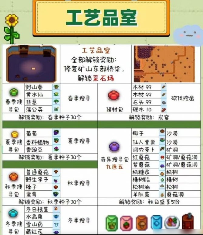 工艺品室:解锁后开启采石场,用炸弹炸可以快速获得石头和矿石,另外获取金镰刀的山洞也在采石场。