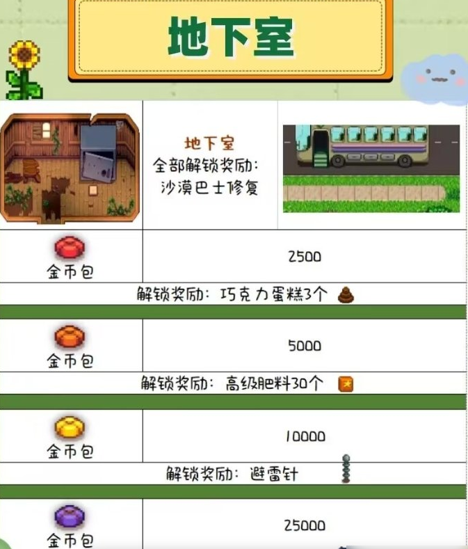 地下室:也叫金库,因为靠赚钱就能解锁,一共42500,。解锁后可以开通去往沙漠的巴士,开启新的冒险,头骨山洞、赌场和解锁鱼缸的沙鱼都在沙漠。