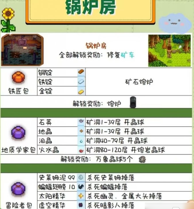 锅炉房:锅炉房的收集包较少,也没有季节限制,多下矿即可,比较容易解锁,而且解锁后可以直达矿洞(矿洞首层),城镇(铁匠旁边),巴士站(家旁边),采石场,省了非常多走路的时间,推荐第一个解锁。