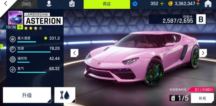 Asterion是兰博基尼家族最没有杀伤力的车型,但78的加速度仿佛在告诉玩家我不是什么好惹得主。获取途径:每日任务卡包
