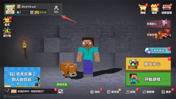 1、打开游戏,点击上方的组队,也可以直接点击开始游戏