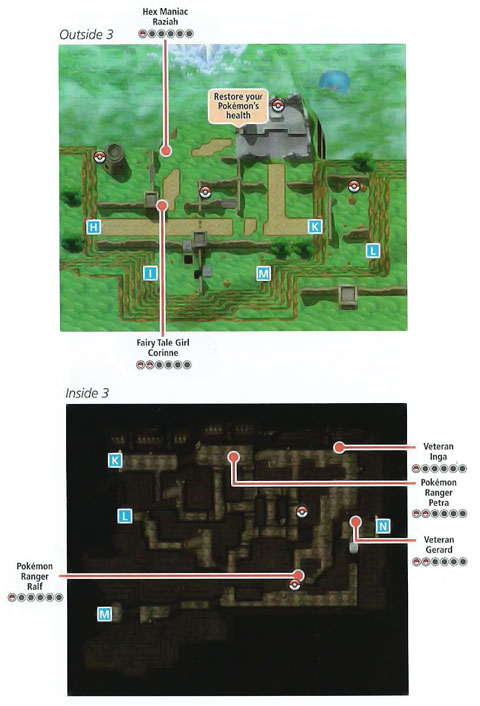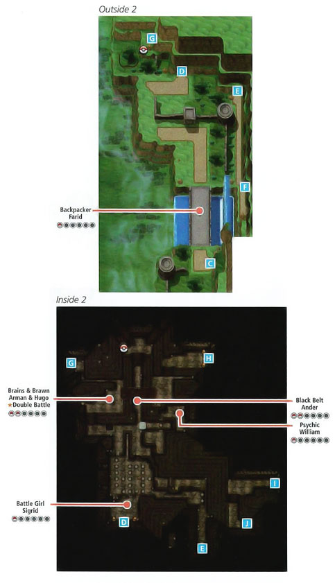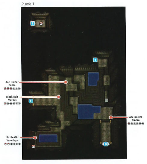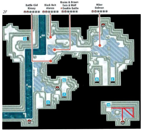 藏的比较隐秘的道具是洞内1里F的TM03(精神冲击),洞内2需要使用怪力的大石头的下面接近可以跳的石头那有个可以碎的石头,碎掉它后绕过那些可以跳的石头来到右下角,通过E就可以到F了