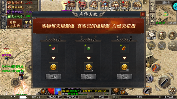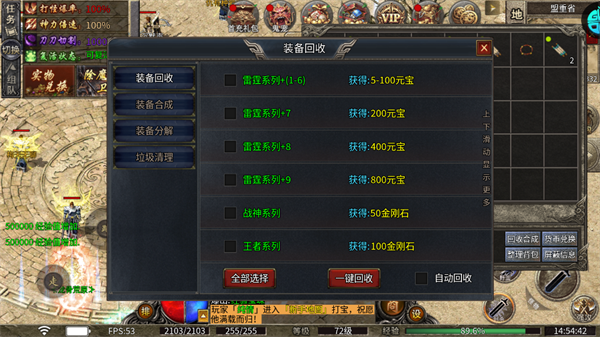 5、低等级装备可以一键回收获得元宝