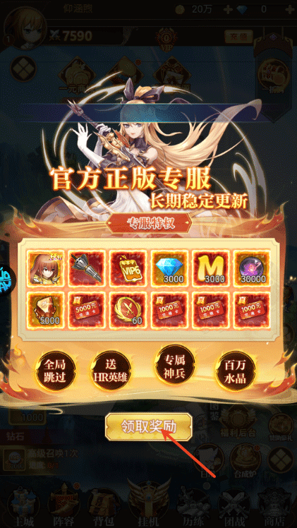 2、首次进入就能领取专属神兵、钻石、各种充值卡等奖励;