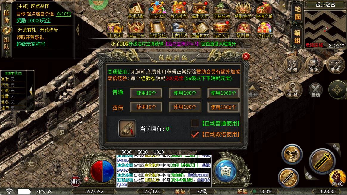 开启“自动双倍使用”经验卷,56级前无消耗快速升级,提升等级基础属性。