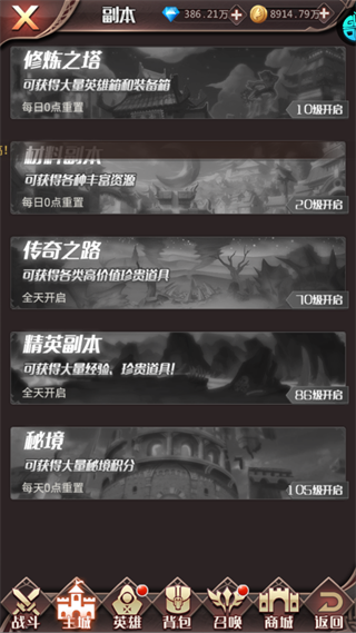 挑战【修炼之塔】【传奇之路】等副本,获取装备、经验及珍贵道具,每日重置后重复刷取可积累资源