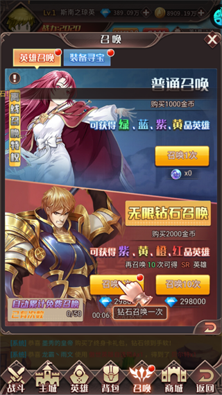 利用【普通召唤】功能获取绿、蓝、紫、黄等品阶英雄,无限钻石召唤还能得更高品阶英雄,助力战力增长