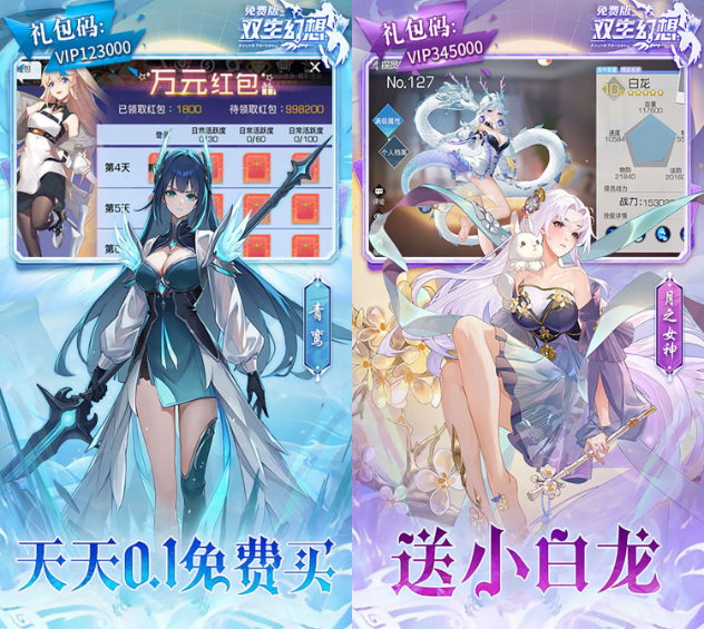 《双生幻想》3.5折撸充免费版是一款融合科幻与魔幻题材的卡牌放置手游,主打“零氪也能毕业”的高福利体验。玩家将化身宇宙探索者,召集五大种族神将,通过挂机收菜、策略布阵与技能连锁机制轻松推图。游戏上线即送648代金券、千连抽、满星SSR角色及无限刷钻工具,支持0.1折购买礼包,充值百倍膨胀,VIP特权免费解锁,真正实现“登录即毕业”,让社畜与学生党无压力畅玩。