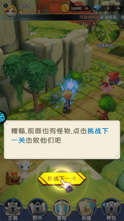 2、进入游戏后依照游戏提示点击挑战下一关;