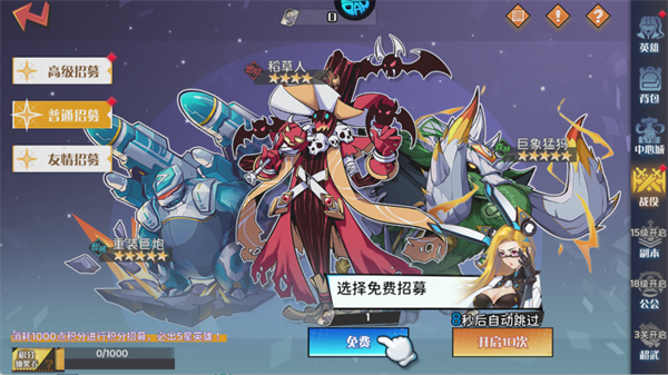 免费招募必拿:进入游戏后优先点击【免费招募】,每日免费招募可积累基础卡牌,且累计消耗1000积分招募必出5星英雄,是前期获取核心战力的关键途径,不要错过免费次数。