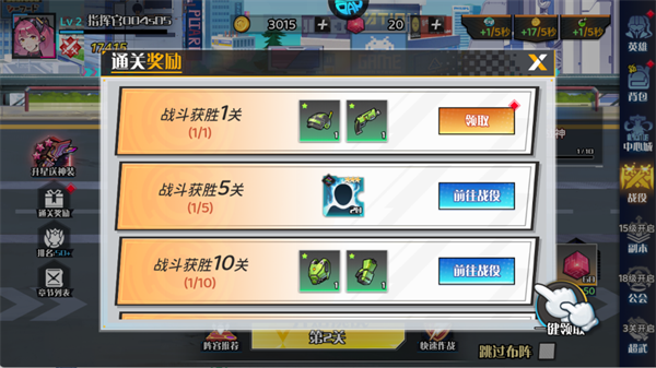 资源初始积累:完成新手引导后的首战,可直接领取通关奖励(装备、道具等),通过【一键领取】快速拿满奖励,为后续养成铺垫基础。