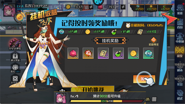 挂机收益不浪费:战斗间隙及时领取挂机奖励,挂机可稳定产出金币、经验、进阶材料等核心资源,挂机时间越长收益越多,建议定时上线领取,避免资源溢出。