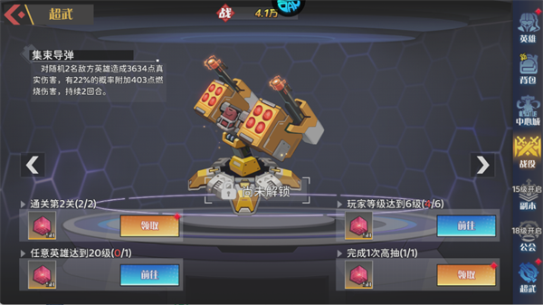 超武解:达成通关第2关、英雄升级、完成高抽等条件后,解锁【集束导弹】等超武,超武能提供高额伤害与持续灼烧效果,是后期推图的核心战力,优先解锁并升级。
