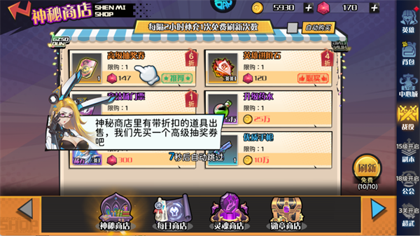 神秘商店:每日免费刷新神秘商店,优先购买折扣力度大的高级抽奖券、英雄进阶石;免费刷新次数用完后,可根据自身资源情况酌情购买升级药水、优质手枪等养成材料。