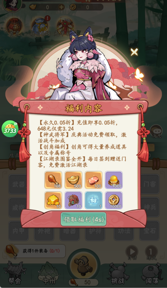 先领取福利内容里的养成道具,同时记得后续利用永久0.05折充值和每日648银票提升资源。