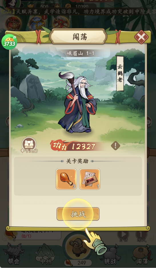 挑战峨眉山等关卡,获取关卡奖励,推进主线同时积累初始资源。