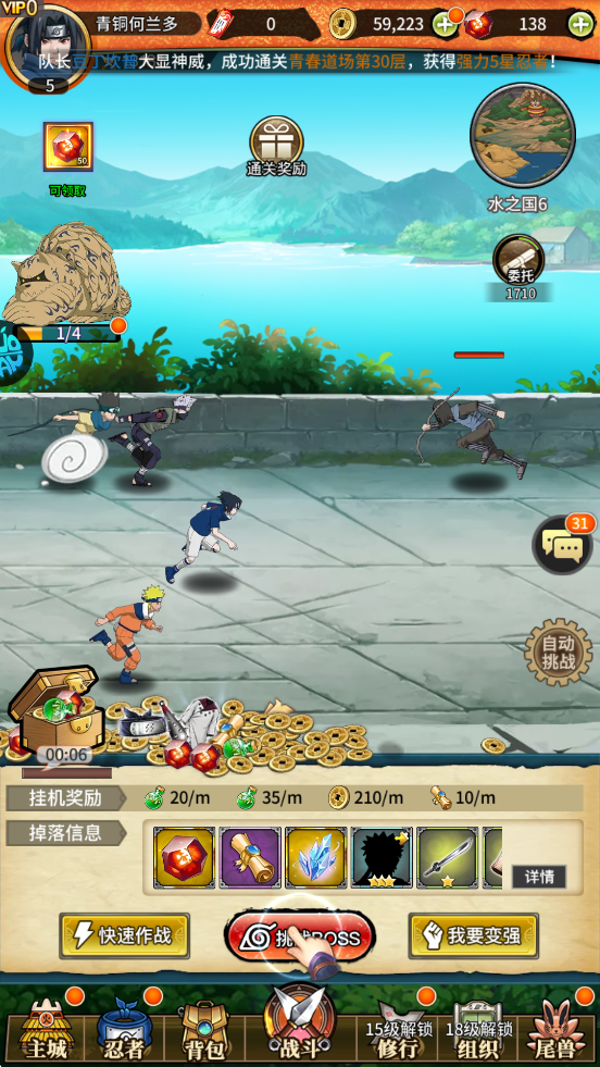 竖版轻量化设计:采用竖屏单手操作模式,内置智能自动闯关与一键跳过战斗功能,挂机即可获取队长经验、金币与忍者培养材料。离线收益与快速作战特权让碎片化时间也能高效养成,完美适配通勤、课间等场景。