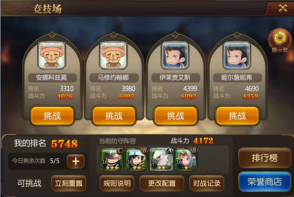 展现自己实力的地方,首次达到最高排名还能获得大量钻石奖励,竞技场中还能获得荣誉点在商店中兑换超值物品。