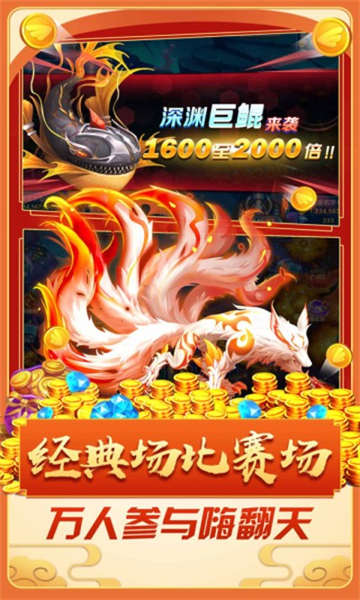 3.多人实时PVP竞技:支持8-12名玩家在同一海域实时捕鱼,实时显示每个人的捕鱼积分和排名,可使用干扰道具增加竞技趣味性。