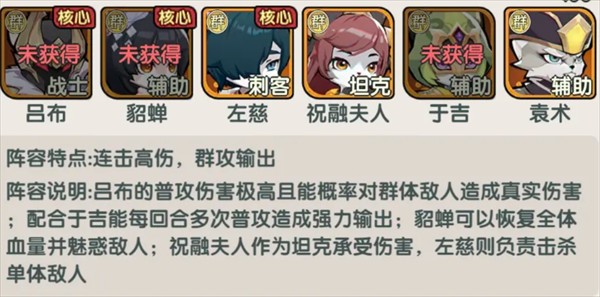 主养吕布,次选于吉。吕布的群体普攻能力极强,而于吉可以帮助吕布增加攻击次数,形成连击效果,造成巨大的伤害。