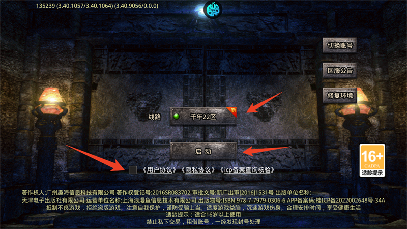 1、登录账号后,先勾选同意用户协议,选择自己所在的区,然后点击启动。