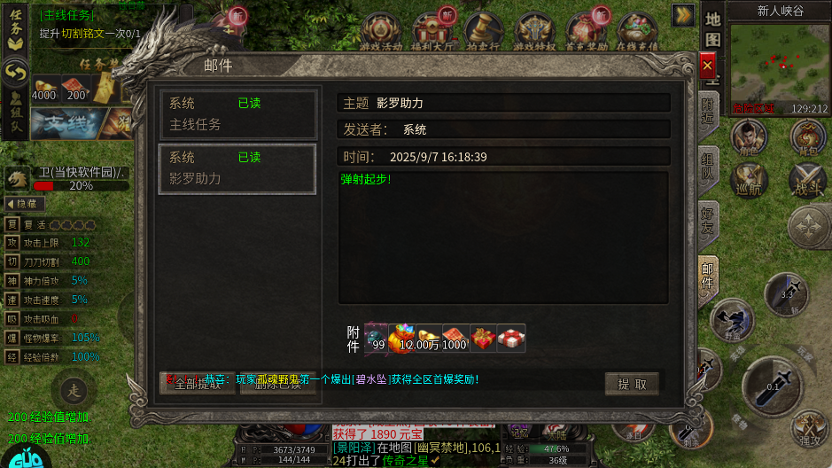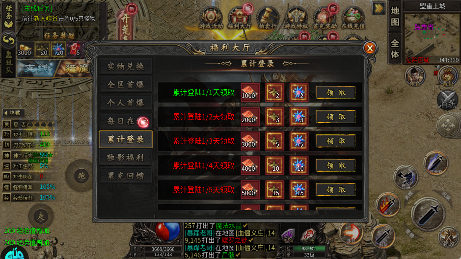 1、进入游戏第一步,一定要记得新手专属奖励,这些装备和道具能让你前期打怪效率直接提升,避免卡关,如图: