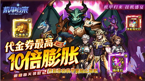 《机甲归来》送1W代金买断版是一款充满美漫风格的MMO挂机手游,以科幻机甲为主题,融合了角色扮演与策略战斗玩法。玩家将扮演地球防卫军指挥官,驾驭个性化机甲对抗外星异灵,守护人类最后的家园。游戏采用震撼的3D无锁定视角与金属质感画风,搭配逼真音效,营造出沉浸式机甲战场。玩家可通过挂机轻松升级,亦可深度参与集群作战、跨服BOSS挑战等多元玩法。独创的“0.1折充值优惠”与“1万代金券买断机制”大幅降低养成成本,首充648仅需6.48元,结合代金券膨胀福利,实现零负担畅游机甲世界。