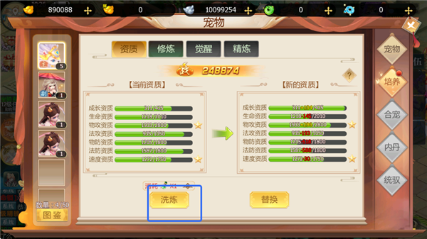 5、如果角色宠物当前资质不满意,可进行资质洗练。