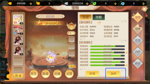 4、在宠物界面中,可为宠物进行加点提升各方面属性。